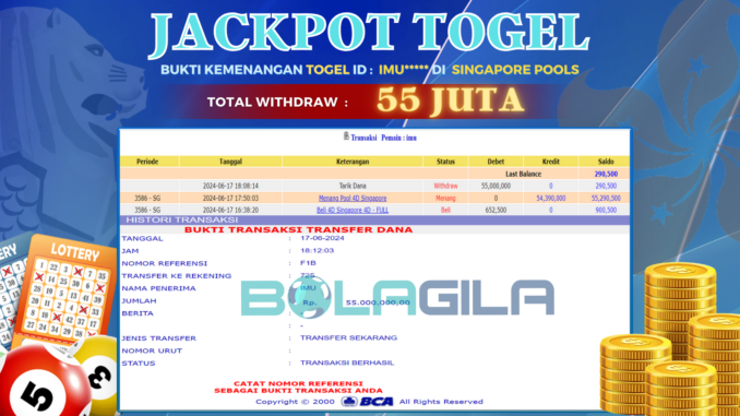 MEMBER BOLAGILA MENERIMA PELUNASAN KEMENANGAN JACKPOT TOGEL di SINGAPORE POOLS Rp 55.000.000,- LUNAS